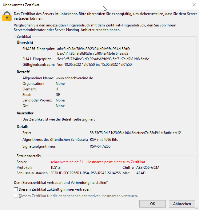 Status: Auflösen der IP-Adresse für schachvereine.de Status: Verbinde mit 212.227.13.232:21... Status: Verbindung hergestellt, warte auf Willkommensnachricht... Status: Initialisiere TLS... Status: TLS-Verbindung hergestellt. Status: Angemeldet Status: Empfange Verzeichnisinhalt... Status: Anzeigen des Verzeichnisinhalts für "/" abgeschlossen